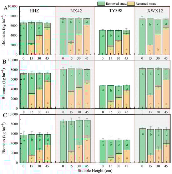 The effect of stubble height on biomass of returned/removed straw. Figures (A–C), respectively, represent the three experimental sites: Yiyang, Zhuzhou, and Hengyang. HHZ, NX42, TY398, and XWX12 represent the four rice varieties Huanghuazhan, Nongxiang 42, Taiyou 398, and Xiangwanxian 12, respectively. In the column chart, the bright cyan and light apricot colors, respectively, represent the removed straw and returned straw. Different lowercase letters of the same color indicate significant differences at the 0.05 level for straw biomass across stubble heights within the same variety.