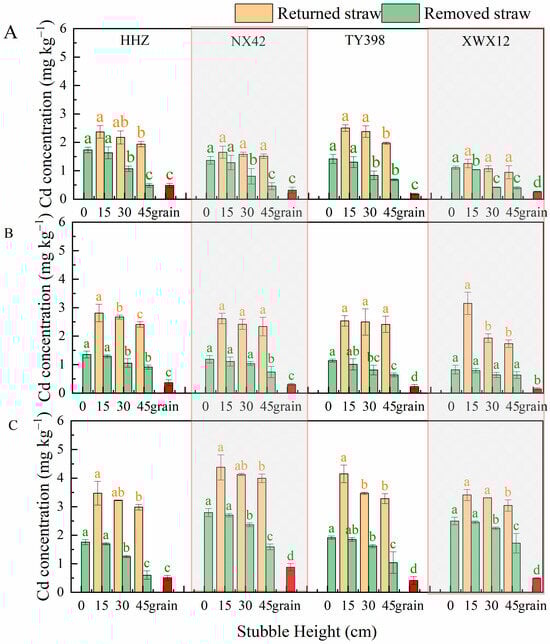The straw Cd concentration at different stubble heights. Figures (A–C), respectively, represent the three experimental sites: Yiyang, Zhuzhou, and Hengyang. HHZ, NX42, TY398, and XWX12 represent the four rice varieties Huanghuazhan, Nongxiang 42, Taiyou 398, and Xiangwanxian 12, respectively. In the column charts, the bright cyan, light apricot, and red colors, respectively, represent the removed straw, returned straw, and grain. Different lowercase letters of the same color indicate significant differences at the 0.05 level for Cd concentration of removed (grain)/returned straw across stubble heights within the same variety.