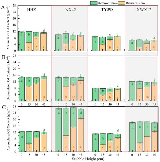 The straw accumulated Cd content at different stubble heights. Figures (A–C), respectively, represent the three experimental sites: Yiyang, Zhuzhou, and Hengyang. HHZ, NX42, TY398, and XWX12 represent the four rice varieties Huanghuazhan, Nongxiang 42, Taiyou 398, and Xiangwanxian 12, respectively. In the column charts, the bright cyan and light apricot colors, respectively, represent the removed straw and returned straw. Different lowercase letters of the same color indicate significant differences at the 0.05 level for the accumulated Cd content of removed/returned straw across stubble heights within the same variety.