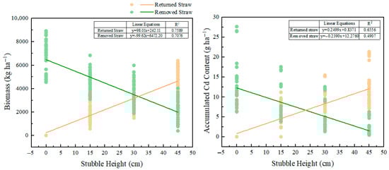 Linear relationship between straw biomass, accumulated Cd content, and stubble height.