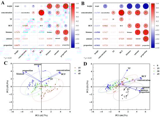 Pearson correlation (A,B) and principal component analysis (C,D) among observed indicators. Figures (A,C) represent returned straw and Figures (B,D) represent removed straw. Labels 0, 15, 30, and 45 represent stubble heights of 0, 15, 30, and 45 cm. Ellipses represent 95% confidence limits. Height, stubble height; concentration, Cd concentration; amount, returned/removed accumulated Cd content; proportion, returned/removed accumulated Cd content proportion.