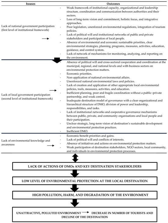 It should be highlighted that Figure 1 presents and summarizes key current (identified) issues and their importance for managing environmental sustainability in destination practices. These relate to environmental awareness and the institutional framework structure at national and local government levels, which destination governance, DMOs, and management efficiency depend on. Their interconnections and interrelations are very deep and represent a complex system with interrelated influences and impacts on the environmental protection of the whole country, and thus local destinations [60,85]. A single point of failure can critically compromise environmental protection. For example, inefficiency in national government governance directly undermines the capacity of local governments and destination management organizations (DMOs). This cascading effect leads to systemic environmental protection failures across all levels, with weaknesses at each tier further weakening the entire structure [9,95]. Thus, the lack of environmental awareness and importance of protecting the environment lead to the passive approach, focusing on economic gains without the anticipation of serious negative impacts on the environment, which will lead to future high economic downturn [73,79]. This particularly refers to leaders and managers at all levels, including in national and local governments [96]. These issues, as highlighted in this study, are also major factors in low levels of environmental practices at destinations, and vice versa.