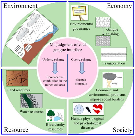 The current low-carbon energy transition is at a pivotal moment within the framework of carbon peaking and carbon neutrality goals. Energy activities are the leading source of global CO2 emissions, with coal contributing a substantial portion [1]. Coal gangue, a byproduct of coal mining and washing, is generated in large quantities. Its effective resource utilization is essential for environmental protection and resource conservation as shown in Figure 1 [2]. The accumulation of coal gangue presents challenges such as secondary contamination and environmental degradation, which necessitate further research into its effects [3]. There is a growing interest in the recycling of coal gangue for various applications, including construction materials [4,5,6], energy generation [7,8], and soil improvement [9,10,11], all of which can help mitigate its environmental impact [12]. Despite its potential, the current utilization rate of coal gangue remains low, primarily due to considerable barriers to effective recycling, including the need for pre-treatment methods [13]. Furthermore, the management of coal gangue is complicated by its inherent properties, such as alkalinity and HM content, which pose risks during transportation and storage [14]. There is a notable lack of comprehensive strategies for the global management of coal gangue, highlighting the urgent need for innovative approaches and policies to address its disposal and utilization effectively.