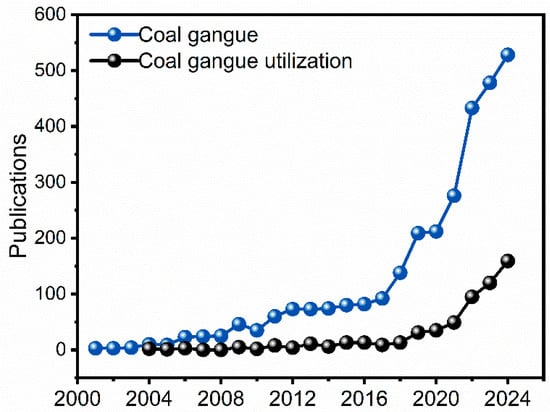 Data were sourced from the “Web of Science” Core Collection, covering the period from 2000 to 2024. A search for the term “coal gangue” resulted in 2998 documents, predominantly articles, which accounted for 82.09% of the total, followed by meeting papers at 13.81% and review articles at 2.43%. The combination of “coal gangue” and “utilization” yielded 579 documents, where articles made up the majority at 94.30%, with conference papers comprising 8.12% and review articles 5.87%. Other document types represented a negligible fraction. As illustrated in Figure 2, there has been a significant increase in the number of published articles on coal gangue. Notably, the annual publication volume related to coal gangue utilization reflects a sustained and growing interest in discovering innovative and fundamental solutions for the effective management and utilization of this waste material.