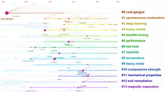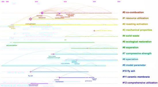 As illustrated in Figure 4, the timeline on the map extends from 2000 to 2024, providing insights into the evolving research interests and advancements in the utilization of coal gangue. The terms range from “co-combustion” to “comprehensive utilization,” reflecting a multifaceted approach to managing and utilizing coal gangue. Notably, the inclusion of terms such as “mechanical properties” and “compressive strength” highlights the focus on the material characteristics of coal gangue and its potential applications in construction. The prominence of “ecological restoration” indicates a rising awareness of the environmental impacts associated with coal gangue, as well as the development of strategies to address these issues. Additionally, the mention of “solid waste” and “fly ash” situates coal gangue within the broader context of waste management, emphasizing its potential role in contributing to sustainable solutions.