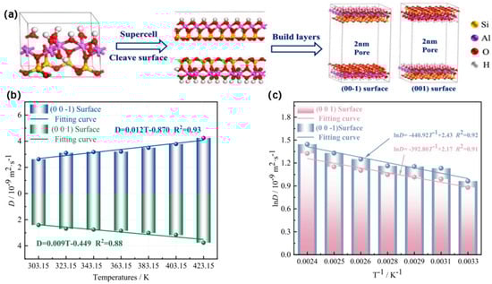 Temperature- and pressure-dependent adsorption–diffusion–seepage behavior of O2 in coal gangue pores. (a) Unit-cell model of kaolinite, its exposed crystallographic surfaces, and the corresponding slit-pore geometry. (b) Temperature evolution of the self-diffusion coefficient (D) for different surfaces. (c) Arrhenius-type plots (ln D vs. T−1) for different surfaces, with linear regression fits. Figure adapted with permission from Ref. [50] (Copyright 2023 Elsevier BV).