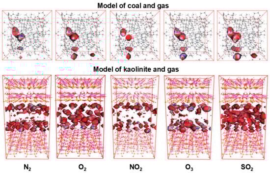The differences in permeability of various gases are not only dependent on the diffusion properties of the gases themselves but also on the structure and type of the permeable material. Utilizing the Wuhai mining area as a reference point, Wang et al. [53] quantified the permeation behavior of five gas species in coal and coal gangue models under variable environmental conditions through grand canonical Monte Carlo (GCMC) simulations coupled with molecular dynamics (MD). The coal model featured a complex molecular structure of bituminous coal, incorporating cycloalkanes and methyl groups, while the kaolinite model represented the coal gangue. A 1nm slit model was created, and ten molecules each of SO2, NO2, O2, N2, and O3 were introduced into both the coal molecular model and the kaolinite model, thereby forming a material–gas system, as depicted in Figure 6. Adsorption simulations conducted under varying pressures using a gas permeation model demonstrated that, at 298K, an increase in pressure significantly influences gas permeation through the coal gangue slit model. Based on the calculations of continuous isodensity and potential energy of five gas molecules O2, N2, SO2, NO2, and O3 in the coal model and the coal gangue slit model at the temperature of 298 K, the blue areas in Figure 6 represent the low-energy regions of gas molecule adsorption, while the red areas represent the high-energy regions of gas adsorption. The larger the display area and the darker the blue zone, the more adsorption sites there are and the lower the energy required, making it easier for gas molecules to adsorb. Conversely, the smaller the displayed area and the darker the red zone, the less likely the gas molecules are to be adsorbed. By analyzing the isosteric heat of adsorption in conjunction with potential energy and the isodensity surface distribution area, it was observed that five types of gas molecules display a consistent adsorption capacity pattern in both coal and coal gangue, ranked as SO2 > O2 > O3 > N2 > NO2. The energy distribution at adsorption equilibrium further confirmed these findings, indicating that the adsorption capacity for SO2 surpasses that of the other gas molecules. Additionally, when examining the effect of temperature on the permeation coefficient, the diffusion coefficient, solubility coefficient, permeation coefficient, and isosteric heat of adsorption were assessed across different temperatures. The results revealed that while SO2 molecules exhibit the weakest diffusion capability, they possess the highest solubility, reinforcing the established pattern. Increasing the temperature aids in the permeation and diffusion of gases, with the rate of permeation being contingent upon the physicochemical properties of the model’s surface, and the adsorption of most gas molecules is primarily physical. In the study of the effects between gas molecules, the gas molecules in the coal model were divided into three groups for comparative study: O2 + N2 (ambient air), SO2 + NO2 + O3 (pollutant gases), and O2 + N2 + SO2 + NO2 + O3 (mixed gases). It was discovered that the permeation and diffusion of gas molecules in coal and coal gangue are influenced by their mixed components. In a mixed gas system, there is a synergistic effect on the diffusion of gas molecules and a hindering effect on adsorption. Moreover, the more components there are in the mixed gas, the stronger the permeation effect of each gas molecule.