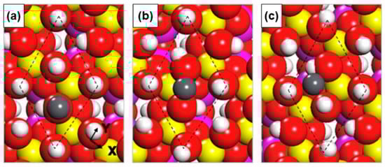 Top views of divalent heavy metal adsorption on the kaolinite (0 0 1) surface: (a) Cd2+/Cu2+/Ni2+ at atop sites, (b) Cd2+/Hg2+ at bridge sites, and (c) Hg2+ at hollow sites. Adsorbed metal atoms are rendered in dim gray for clarity. Figure adapted with permission from Ref. [59] (Copyright 2014 Elsevier B.V.).