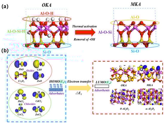 In the coal or coal gangue power generation, HM ions are prone to enrichment in fine particulate matter and escape from pollution control devices into the atmosphere, constituting a significant source of air pollution [60]. Therefore, it is essential to explore the migration issues of HM ions during the combustion process, and kaolinite is commonly added as an ion adsorbent. The computational chemistry strategies provide sustainable management solutions by employing quantum chemistry to explore the mechanisms of interaction between coal gangue and heavy metal species. Cheng et al. [61] employed an integrated experimental–theoretical approach to elucidate the adsorption behavior and mechanistic origins of Pb- and Cd-containing vapors on Si/Al-based sorbents. Adsorbate species—Pb, PbCl, PbCl2, Cd, CdCl, and CdCl2—were modeled on the metakaolinite (0 0 1) surface, and adsorption energies together with charge-density-difference analyses were evaluated. Chemisorption was identified as the dominant interaction mode, with Pb-bearing species exhibiting consistently higher adsorption energies than their Cd counterparts. Surface-exposed oxygen atoms and under-coordinated aluminum centers act as primary active sites: Pb/Cd atoms coordinate to surface O sites, while Cl atoms interact strongly with unsaturated Al atoms, thereby facilitating the retention of Pb and Cd chlorides by metakaolinite. Through the application of frontier orbital theory and DFT calculations, Li et al. [62] elucidated the adsorption characteristics and active sites involved in the capture of semivolatile heavy metal elements during coal combustion. The computational models revealed that metakaolin, a thermal transformation product of kaolinite, exhibits stronger adsorption activity than kaolinite itself, with PbO being more readily adsorbed than PbCl2 onto the kaolinite (DeOH 001) surface. The dehydroxylation process of kaolinite and the subsequent changes in aluminum coordination numbers have been shown to significantly influence the adsorption activity, highlighting the importance of understanding the thermal conversion processes of coal gangue minerals. Yang et al. [63] conducted a comprehensive study on the efficient capture and characteristics of HMs (Pb, Cd, Cr, and Zn) emanating from coal combustion using modified kaolinite as illustrated in Figure 10. They employed a combination of experimental methods and DFT simulations to explore the adsorption behaviors and mechanisms. Utilizing Frontier Molecular Orbital (FMO) analyses, they elucidated the adsorption of HM oxides and chlorides onto original kaolin (OKA), metakaolin (MKA), θ-Al2O3, and α-Al2O3. Competitive adsorption was observed between oxides and chlorides, with oxides showing a significant advantage. Specifically, for OKA and MKA, the Al-O-Si-H and Al-O-Si surfaces were identified as the most favorable for adsorption. However, it was noted that CdO and CdCl2 showed minimal adsorption on the Si-O surface of OKA, highlighting the selectivity of the adsorbent surfaces towards different HM species. These theoretical findings offer valuable guidance for the development of modified kaolinite additives designed to enhance the capture of HMs in high-temperature furnaces, thereby contributing to the sustainable management of coal gangue and the mitigation of environmental pollution from heavy metal emissions.