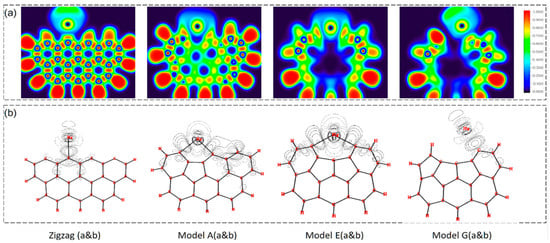 Unburned carbon in fly ash from power generation is also considered a promising adsorbent [64], and theoretical insights from computational chemistry offer strategic advantages in the utilization of this byproduct from coal combustion. Yan et al. [65] conducted a comprehensive density-functional theory (DFT) study of Hg0 adsorption on defective carbonaceous surfaces to identify the active sites governing mercury capture. The study systematically modeled various defective structures of carbonaceous surfaces, including those with zigzag and armchair edges, to evaluate their adsorption potential. The DFT calculations revealed that defective carbonaceous surfaces exhibit enhanced chemisorption properties compared to non-defective ones, with significant improvements in adsorption energy observed at surface defects. As shown in Figure 11, the electron localization function (ELF) and electron density difference analyses elucidate the nature of interactions between Hg0 and the carbon surface, underscoring the role of vacancies as primary adsorption sites. Furthermore, the study delves into the influence of oxygen-containing functional groups on the adsorption process, finding that semiquinone groups on certain defective surfaces promote chemisorption of Hg0. This theoretical work not only advances the understanding of mercury capture mechanisms on carbon materials but also paves the way for the development of cost-effective and environmentally benign strategies for mercury removal from coal combustion flue gas, thereby contributing to the sustainable management of coal gangue.