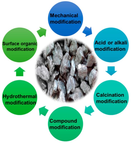 To enhance the value of coal gangue and promote resource utilization, various modification methods have been extensively studied as shown in Figure 12, including mechanochemical modification [77], acid or alkali treatment [78], surface organic modification [79], calcination [80], hydrothermal modification [81], and composite modification. These methods aim to alter the physicochemical properties of coal gangue, thereby improving its reactivity and stability and expanding its potential applications across various fields. Computational chemistry offers theoretical support and predictive tools for the modification of coal gangue by simulating and calculating the electronic structure of molecules and materials. Furthermore, the application of computational chemistry is also reflected in the assessment of thermodynamic and kinetic stability during the coal gangue modification process, which is crucial for designing and developing novel modification methods.