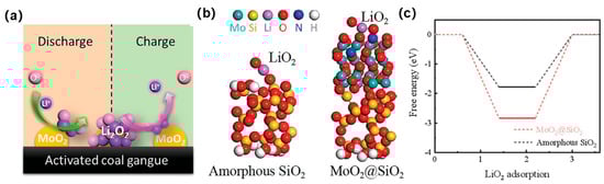 Calcination modification refers to the process of transforming the low-surface-activity kaolinite in coal gangue into highly active metakaolin through high-temperature calcination. This process alters the porosity and crystal structure within the coal gangue. The extent of calcination modification is primarily influenced by the calcination temperature and duration. Variations in these two key factors lead to different phase transformations in the kaolinite within the coal gangue, resulting in performance disparities in the calcined coal gangue. High-temperature calcination can remove carbon components from the coal gangue and hydroxyl groups from kaolinite, leading to changes in the Si-O and Al-O tetrahedral structures, significantly enhancing the activation level of the coal gangue [82]. After reasonable treatment, it can be transformed into beneficial catalysts and electrode materials [83]. The various adsorption sites on the surface can participate in interfacial reactions to construct materials with high electrochemical activity [84,85]. Sun et al. [86] prepared a coal gangue-derived MoO2–coal gangue electrocatalyst, which serves as the cathode for lithium–oxygen batteries (LOBs) as shown in Figure 13. The LOB assembled with the MoO2–coal gangue cathode exhibits excellent rate performance and long-lasting cycling stability. The reason is that the activated coal gangue with an amorphous flake-layer structure acts as a protective layer, optimizing the structural stability of MoO2–coal gangue, providing ample space for product deposition, and uniformly loading N-doped MoO2 nanoparticles and coal gangue, which are conducive to optimizing catalytic performance and serving as substrates to ensure structural stability. To clarify the intrinsic properties of MoO2–coal gangue composites and to assess how N-doped MoO2 influences the formation pathway of LiO2 intermediates, periodic density-functional theory (DFT) calculations were conducted. Amorphous SiO2 present on the gangue surface exhibits semiconducting behavior with a computed band gap of 1.68 eV, whereas N–MoO2@SiO2 displays a metallic character and markedly enhanced electronic conductivity. The N-doped MoO2 nanoparticles accelerate charge transport and increase electrocatalytic activity. Adsorption of LiO2 is pivotal for Li2O2 formation/decomposition and overall Li–O2 battery (LOB) performance; N–MoO2@SiO2 affords an adsorption energy of −2.84 eV, substantially exceeding that of pristine SiO2 (−1.78 eV). This stronger LiO2 anchoring promotes LiO2 oxidation and improves both oxygen reduction (ORR) and evolution (OER) kinetics during cycling. The N–MoO2 nanoparticles thus enhance electronic conductivity and LiO2 adsorption, while the amorphous SiO2 substrate stabilizes the composite architecture. This work provides a new route for valorizing mining solid waste as electrocatalysts for energy storage systems and advances the sustainable utilization of coal gangue.