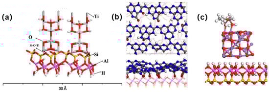Surface functionalization of mineral-based composite catalysts derived from coal gangue offers a promising route for sustainable pollutant degradation. Li et al. [92] examined the interfacial coupling between TiO2 and kaolinite and the influence of surface-bound hydrogen, using a CH3COOH-functionalized TiO2/kaolinite model (Figure 14a). Both the pristine and CH3COOH-functionalized composites exhibit a direct band gap, which facilitates enhanced charge carrier mobility and accelerates reaction kinetics. The introduction of hydrogen altered the orbital constitution, increasing the proportion of d and f orbitals, which is favorable for electron transition or migration. Zhang et al. [93] focused on the hybrid catalysts (CN-CGs) derived from coal gangue and graphitic carbon nitride (g-C3N4), as shown in Figure 14b, which are designed to activate peroxymonosulfate (PMS) for the degradation of bisphenol A (BPA). The introduction of double-nitrogen defects, cyano groups, and nitrogen vacancies into the g-C3N4 framework, facilitated by the hydroxyl groups of CG, results in a narrowed band-gap energy and enhanced catalytic activity. By leveraging the properties of kaolinite and integrating it with FeOx/MnOy, this formed FeMn@kaolinite, a catalyst with enhanced activity for peroxymonosulfate (PMS) activation, as shown in Figure 14c [94]. Zhai et al. [95] employ DFT calculations to elucidate the mechanism behind PMS activation and the degradation pathways of polyvinyl alcohol (PVA), which reveals the role of oxygen vacancies in facilitating electron transfer and the interaction between PVA and the catalyst. The computational chemistry perspective provides insights into the sustainable utilization of coal gangue by transforming it into a functional material that can effectively degrade pollutants, thereby offering an environmentally friendly solution for waste management and contamination control.