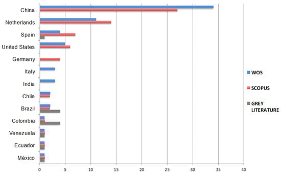 Number of documents retrieved from Scopus and WoS databases and grey literature sources, categorized by country of origin.