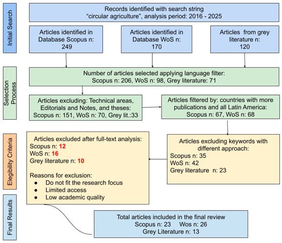 To complement the analysis, the search was expanded to include grey literature in order to incorporate high-quality publications that may not be indexed in Scopus or WoS, may be published in languages other than English, and may originate from Latin America. A free web search engine using two strings was used: the first, “circular agriculture” + models, applying the same time frame as before (2016–2025), and the second “agriculture circular”, in Spanish.