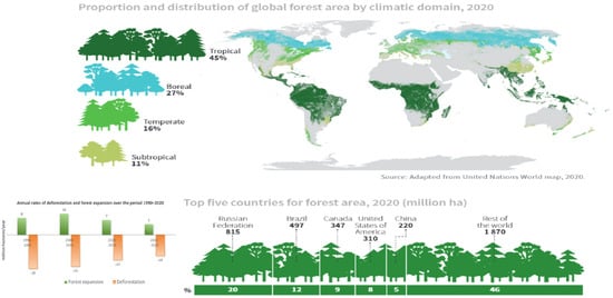 Proportion and distribution of global forest area and annual rates of deforestation and forest expansion over the period of 1990–2020. Adapted from FAO (2020).