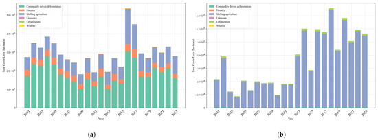Reasons for the decline in forest cover in Brazil and Ghana over the past decades. (a) Tree cover loss in Brazil by year and cause. (b) Tree cover loss in Ghana by year and cause.