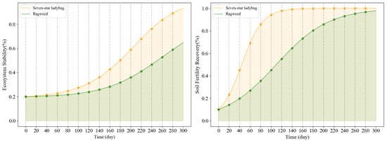 Under the lady beetle scenario, the stability index remained above 90%, with pest populations effectively controlled. This reduced pesticide dependence and enabled the establishment of a biologically regulated system. Additionally, the soil fertility index recovered to approximately 95% of its baseline value after 100 simulation days.
