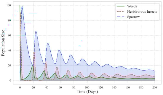 At the same time, biological control strategies are regarded as critical alternative solutions for promoting the transition to green agriculture and reducing reliance on chemical inputs. Previous studies have shown that, within a particular spatial scale, the introduction of a single functional predator species (such as birds or bats) can reduce pest population densities by 20–40%, significantly enhancing system stability and self-regulation capacity [18,19,20]. However, most existing models are confined to short-term cycles and single-species intervention scenarios, lacking integrated simulations of collaborative mechanisms among functional species across multi-trophic structures [21]. Additionally, the competitive impacts of invasive plants such as ragweed have long been underestimated. According to survey data from the U.S. Department of Agriculture, ragweed has colonized approximately 12 million hectares of farmland in North America, leading to an average 22% reduction in crop yields and disrupting local plant communities by altering nutrient cycling processes [22,23]. However, the mechanisms by which it acts as a disturbance factor in agricultural ecosystems have yet to be effectively incorporated into ecological modeling frameworks.