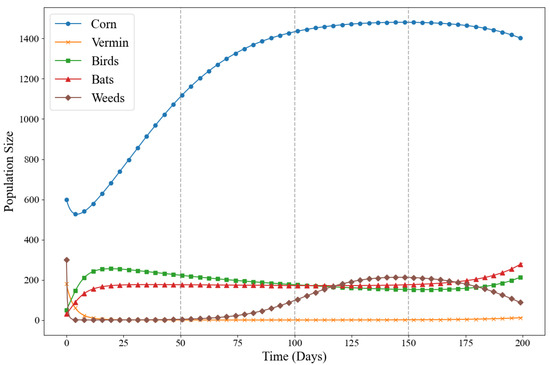 Although both are predators, interspecific competition still occurs, mainly due to niche overlap. We developed a differential equation system modeling the interactions among bats, birds, insects, and crops and solved it numerically using the fourth-order Runge–Kutta method over 200 days.