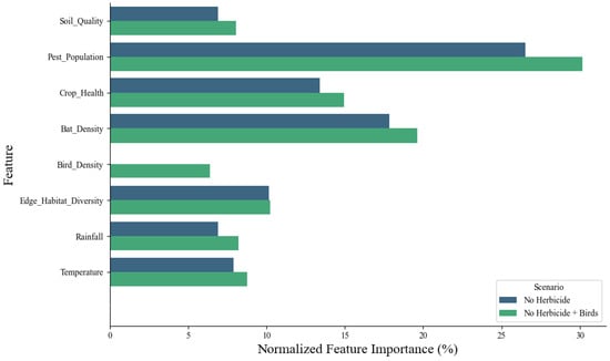 To identify key drivers of stability, we applied XGBoost for feature importance analysis using simulation outputs. The top five features influencing system balance were bat abundance, herbicide concentration, initial crop density, predation efficiency, and weed competition intensity. Figure 8 illustrates the effect on other characteristics in both the herbicide-free and herbicide-treated scenarios with birds. These factors underscore the significance of biological control strength and resource competition in maintaining agroecosystem stability. The central role of predator–prey dynamics suggests that multi-level trophic control networks are critical for sustainable recovery.
