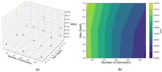 To optimize the model under limited data conditions, we further fine-tuned the XGBoost hyperparameters through a comprehensive grid search, as this exhaustive and deterministic search strategy ensures the identification of globally optimal parameter combinations without relying on stochastic variability. Specifically, we systematically evaluated combinations of learning_rate (), max_depth (d), and n_estimators (N) via five-fold cross-validation (see Figure 9). This optimization improves the reliability of subsequent sensitivity analyses, ensuring that the key identified drivers are both statistically solid and ecologically significant. The optimal configuration ( = 0.1, d = 3, N = 150) achieved outstanding predictive performance with a coefficient of determination of (95% CI: 0.958–0.965) and root mean squared error of (95% CI: 0.031–0.035). Sensitivity analysis revealed that learning_rate exhibited the dominant influence (Shapley value = 0.62 ± 0.03), demonstrating the model’s robustness to variations in tree complexity parameters.