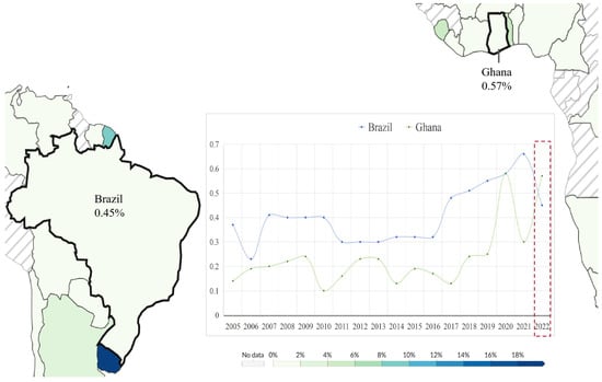 Figure 10 shows the proportion of organically managed land in Brazil and Ghana. As of 2022, Brazil’s organic farmland comprised 0.45% of total arable land, while Ghana’s was 0.57% [29].