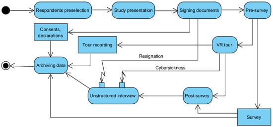 Research procedure is presented in Figure 1. The first step was respondent (participant) preselection, when people with obvious contraindications (e.g., health issues) to participating in a VR session, or uninterested in the research topic, were excluded from the study. The second step was study presentation, when respondents were informed about the research purpose. Basic notions, like sustainable tourism, etc., were explained as well. During the explanation, statements that may influence respondent’s choices were avoided. The third step was signing documents, when respondents signed all necessary consents and declarations. These documents were archived. It was possible to drop participation in the research at this stage—the respondent was interviewed about the reasons later. The next step was pre-survey—its content is described in another subsection, “pre” because it was conducted before the virtual tour. The next step was VR tour—setting and VR application are described in another subsection. If the respondents were tired, sleep-deprived, or hungry (according to brief informal interview), they were not allowed to participate in the VR session on that day—they were asked to come back later in proper condition. Respondents were instructed on how to participate in the virtual tour using the VR laboratory equipment. The time of virtual tour was not officially limited, although assumed duration was below 30 min. No signs of rushing (either of any time limit) were given to a respondent. It was respondent’s choice whether he stood or seated during the VR session. At any stage of the virtual tour, a respondent could drop participation in the research, e.g., due to unexpected symptoms of cybersickness—the respondent was interviewed about the reasons later. Each virtual walk was documented and archived. Next, the post-survey was conducted. Respondent was given the same questionnaire (and a pen of different color) as in the case of pre-survey. Two benefits of such approach may be mentioned—being able to see whether participation in the virtual walk changed respondent’s opinions and more efficient coping with respondents in the VR laboratory. During pre- and post-survey, statements that may influence respondent’s choices were avoided. Survey questionnaires were archived. At last, unstructured interview was conducted, to reveal knowledge, facts, thoughts, and/or reasons that may have not been expressed on a survey questionnaire. Finally, archiving activities were performed, to keep experiment data.