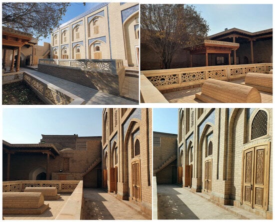 The VR tour, that is one of the central points of this study, was based on the virtual tour application created by the Lab3D (part of the Department of Computer Science, Lublin University of Technology) members. Tour participants were using VR goggles to visit the Pahlavon Mahmud mausoleum, that was reconstructed in virtual reality from 3D scans of the real place acquired by the Lab3D members. The mausoleum is a memorial monument situated in the Itchan Kala (Old Town) area in Khiva, Uzbekistan (Figure 2). The whole complex has a total area of 50 × 30 m, and consists of the inner mausoleum chambers and the courtyard. It was originally built in 1664 over a grave of Pahlavon Mahmud, a local poet, whose tomb is considered a sacred place by some Uzbeks and Turkmens. The place is frequently visited by regular tourists and even pilgrimed to [53].