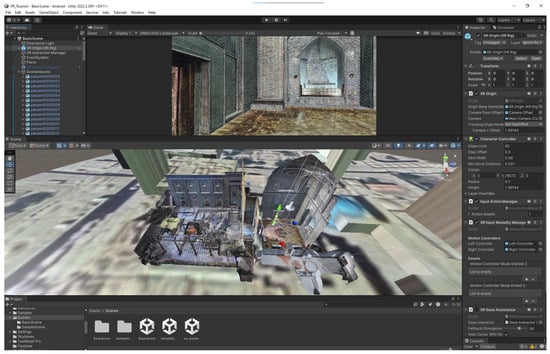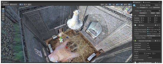 The VR application is constructed of a single scene in Unity, where only the scanned building is available to visit, without any additional elements. It was built from scratch using Unity 3D engine and its Virtual Reality platform (Figure 3).