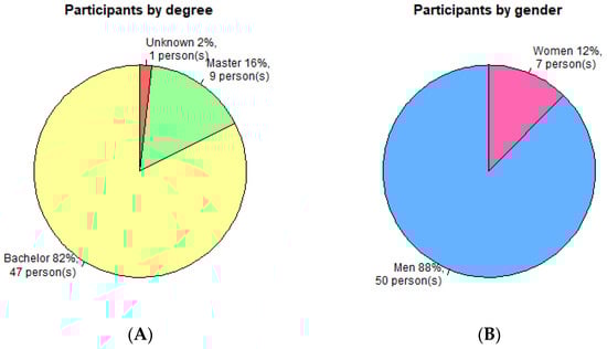 In total, feedback from 57 study participants was gathered: 55 persons originating from Poland, 1 from Ukraine, and 1 from Belarus. All of them were students of Lublin University of Technology: 3 of them were studying Multimedia Engineering, while the rest of them (54 persons) were Computer Science students; 47 persons were attending Bachelor’s degree studies, 9 persons Master’s degree studies, and, finally, 1 person did not provide such information (Figure 5A); and 50 men and 7 women participated in the study (Figure 5B). The age of respondents varied from 20 years old to 24 years old (Figure 6A).