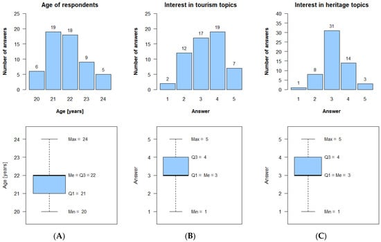 Histograms and box plots depicting distribution of answers regarding (A) the age of respondents, (B) interest in tourism topics—Q7, and (C) interest in heritage topics—Q8.