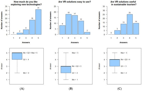 Histograms and box plots depicting distribution of answers regarding (A) liking to explore new technologies—Q14, (B) easiness of VR solutions use—Q15, and (C) usefulness of VR solutions in sustainable tourism—Q16.