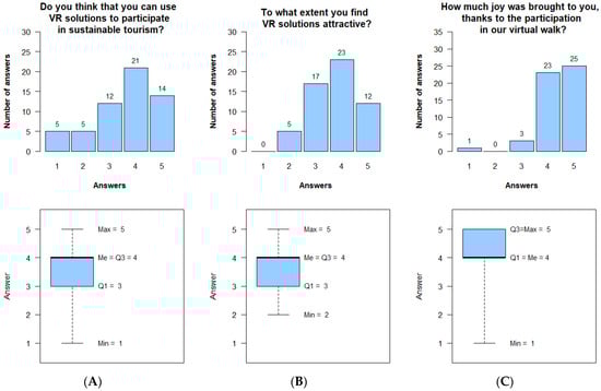 Histograms and box plots depicting distribution of answers regarding (A) use of VR solutions to participate in sustainable tourism—Q17, (B) VR solutions attractiveness—Q18, and (C) joy brought to a person thanks to the participation in the VR tour—Q19.