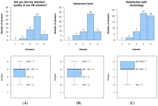 Histograms and box plots depicting distribution of answers regarding (A) quality of the VR tour user interface—Q20, (B) immersion level—Q21, and (C) satisfaction with technology—Q22.