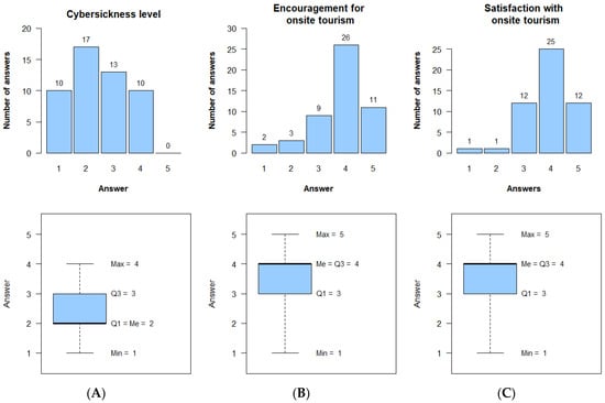 Histograms and box plots depicting distribution of answers regarding (A) cybersickness level—Q23, (B) encouragement for onsite tourism—Q25, and (C) satisfaction with onsite tourism—Q31.