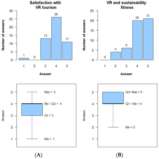Histograms and box plots depicting distribution of answers regarding (A) satisfaction with VR tourism—Q32, and (B) VR and sustainability fitness—Q33.