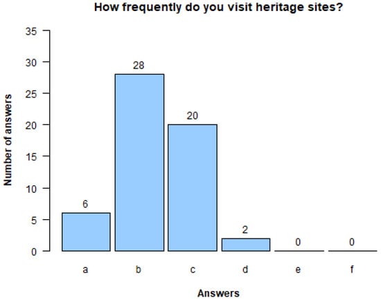 Histogram of answers regarding frequency of visiting heritage sites—Q11 ((a) I am not visiting them at all, (b) Once for a few years, (c) Few times a year, (d) Few times a month, (e) Few times a week, and (f) Everyday).
