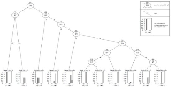 In order to check whether it is possible to predict a person’s attitude towards the use of VR in sustainable tourism development, based on the answers given to the remaining survey questions, a decision tree was used. Decision trees work by recursively splitting the data into subsets that maximally reduce uncertainty. The C5.0 algorithm was used. This model extends the classification algorithms developed by Ross Quinlan. The number of boosting iterations was set to 100 and the best model (providing the shortest paths) was used.