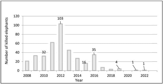 Number of elephants poached for trophies between 2008 and 2022 in NRT member conservancies in Kenya (Source: NRT).