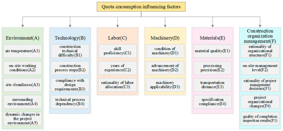 Based on the literature review and expert consultation, 24 influencing factors were selected and analyzed using the DEMATEL-ISM method. This approach determined the importance of each factor and their interdependencies, generating a hierarchical structure and assigning weights for gray clustering calculations. The systematic analysis of these interactions mitigated the subjectivity of traditional methods. The findings indicate that technical factors (B1–B4) and construction management factors (F3–F5) serve as core driving forces, while labor-related (C2) and mechanical (D1–D2) factors act as outcome-driven indicators, reflecting the cascading effects of upstream management decisions. The dual-track mechanism of technology-driven and management-controlled processes provides a strategic direction for optimizing quota productivity.