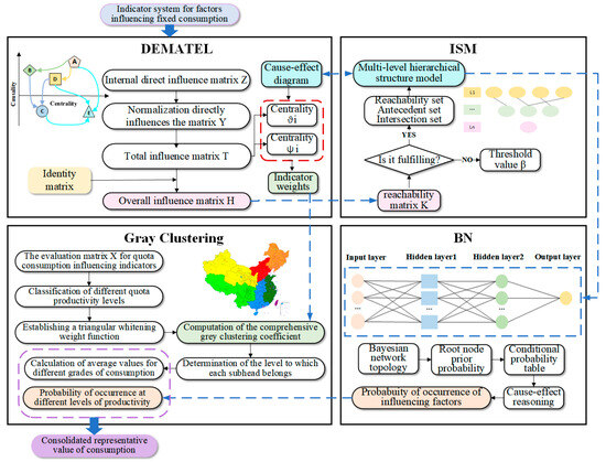 To enhance the scientific accuracy and rationality of quota consumption estimation, a combined model integrating the DEMATEL, ISM, BN, and gray clustering methods was developed. This model refines the determination of quota consumption by systematically analyzing and quantifying influencing factors. The workflow of the integrated model is illustrated in Figure 2.
