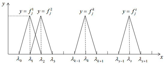 - The value range of indicator j is divided into adjacent subintervals according to practical considerations. These intervals are denoted as [λ1,λ2], …, [λk,λk+1], …, [λs,λs+1]. By sequentially connecting adjacent interval boundaries, the final triangular whitening weight function fjk(·) for indicator j corresponding to gray category k is constructed, as illustrated in Figure 3.