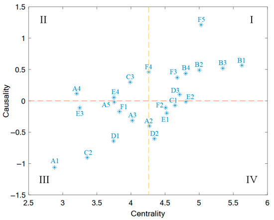 Cause–effect diagram of influencing factors. The horizontal and vertical dashed lines represent the average values of Centrality and Causality, respectively, and divide the diagram into four quadrants (I–IV) for factor classification. The symbol ‘*’ denotes the position of each influencing factor in the diagram.