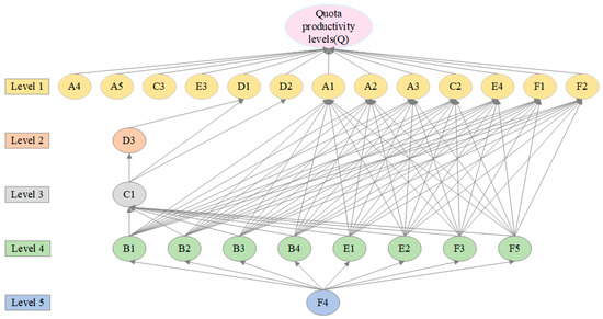 The multi-level hierarchical structure model of the factors influencing quota consumption (Figure 6) reveals that the top layer, L1, comprises 13 indicators: A4, A5,C3, E3, D1, D2, A1, A2, A3, C2, E4, F1, and F2. These indicators are the direct factors in forming and enhancing quota productivity levels. The intermediate layers L2, L3, and L4 serve as transitional stages for improving quota productivity, acting as connectors within the system. Indicators in these layers influence the entire system through the top-level indicators and are directly affected by the lower-level indicators. Specifically, L2 includes D3; L3 comprises C1; and L4 encompasses construction B1, B2, B3, B4, E1, E2, F3, and F5. The L5 layer, positioned at the lowest level of the hierarchical model, is the foundation of the quota productivity levels. The key factor at this level, F4, is fundamental in shaping overall productivity. Its influence extends through multiple pathways, affecting both intermediate- and top-level indicators, ultimately impacting the entire system.