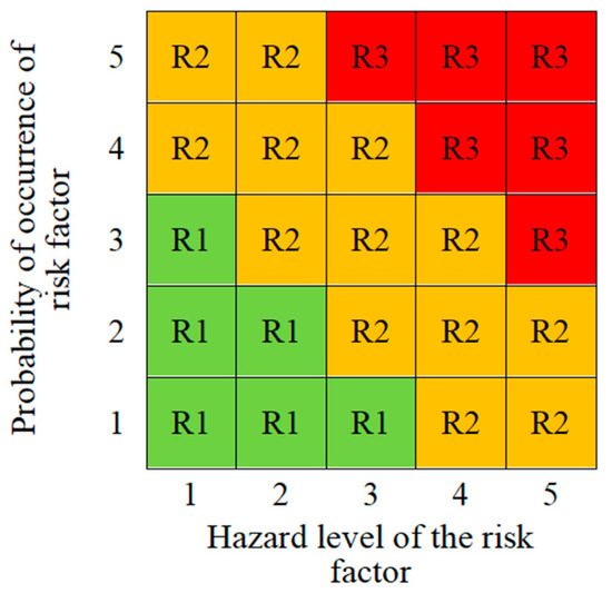 A quota productivity level questionnaire was designed based on Figure 1, and relevant data questionnaires were collected through distribution; 61 questionnaires were distributed, 59 were retrieved, and 40 were valid questionnaires. Based on the generic risk assessment method in ref. [36], the risk level was divided into three orders. Among them, the higher risk level corresponded to the lower level of fixed productivity. The probability of occurrence of risk and the degree of hazard were used as the vertical and horizontal axes of the risk matrix, where the larger the value, the deeper the corresponding degree, as shown in Figure 6. The R1 region is located in the low-risk zone (lower left corner) of the risk matrix, which indicates higher stability and thus corresponds to the “advanced” region of the quota productivity level; and the R3 region is located in the high-risk zone in the upper right corner. R3, in the upper right corner of the high-risk zone, corresponds to the “conservative type”; R2 is the middle transition zone, corresponding to the “more advanced type”. The classification standard comprehensively refers to the practice of risk control in project management, combined with the practical experience of high-standard farmland projects, and has been agreed upon by experts through discussions, with methodological basis, interpretability, and support from experts in the field; it can also effectively reflect the differences in the level of productivity of the quota between regions.