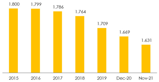 Given their critical role in supporting MSMEs and fostering local economic development, BPRs are seen as an essential part of Indonesia’s microfinance ecosystem [6]. They offer financing, enhance business capabilities, and contribute to local employment [7]. Despite this, they continue to face structural challenges. From 2008 to 2018, over 90 BPRs were liquidated, and the number of operational institutions decreased from 1800 in 2015 to 1631 in 2021, as depicted in Figure 1.