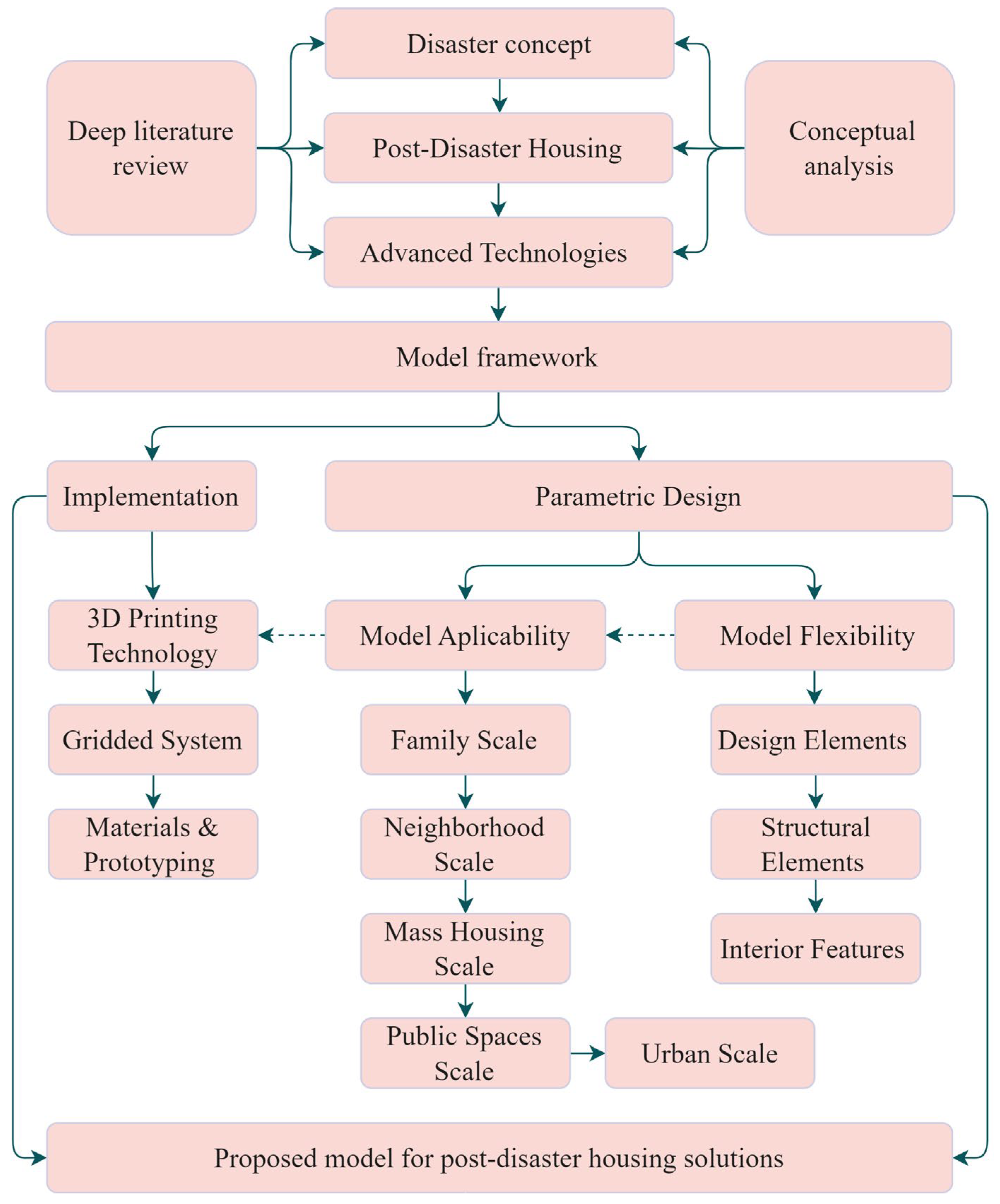 This study proposes an innovative post-disaster housing model that integrates parametric design, three-dimensional (3D) printing technology, and flexible modular systems to respond to the urgent shelter needs arising after disasters. The primary aim of the research is to evaluate the model’s applicability and adaptability across multiple spatial scales. To achieve this, a multi-layered methodological framework was adopted, consisting of three principal phases: (1) theoretical framework development, (2) parametric design process, and (3) implementation and prototyping. The detailed methodology of this study is visually represented in