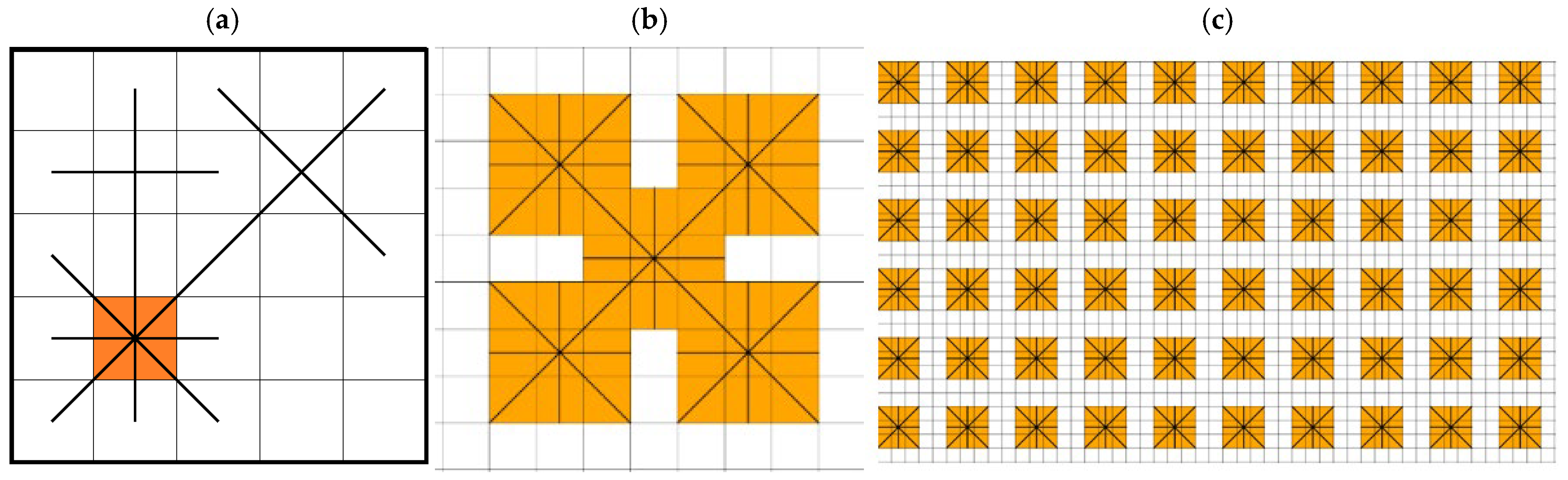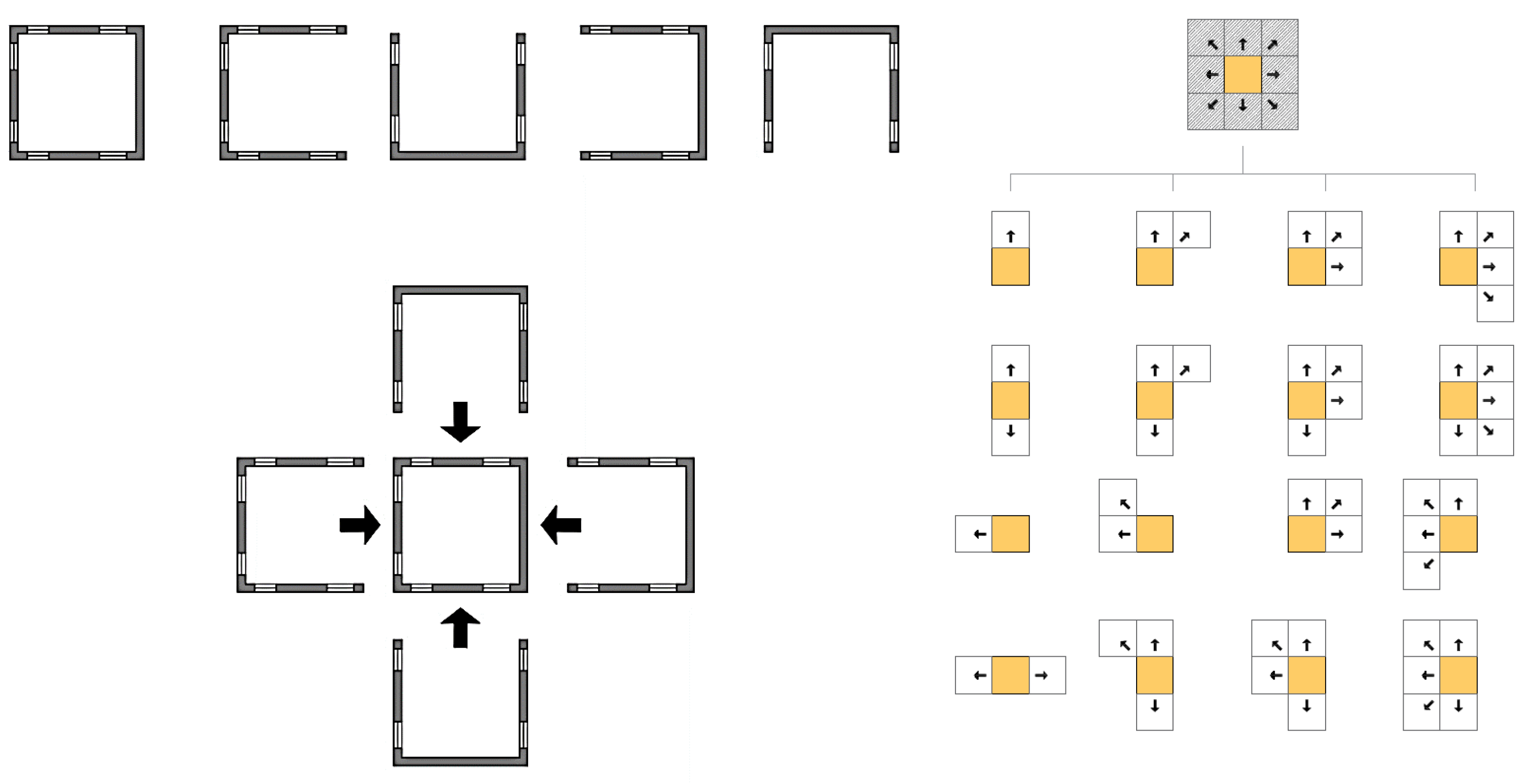 Figure 13. The Rook model facilitates linear movement exclusively along orthogonal (horizontal and vertical) axes, while the Bishop model permits diagonal movement. Integrating both linear and diagonal proficiencies, the Queen model offers comprehensive movement versatility. These distinct gridded systems are instrumental in defining specific functional relationships and connectivity patterns within a given neighborhood, each offering a unique degree of flexibility and movement capacity. At the neighborhood scale, a modular system predicated on parametric design methodologies has been developed. This system provides highly customizable design components, tailored to specific user requirements. By leveraging computational design tools such as Grasshopper, fundamental modules can be configured with rapid adaptability in horizontal, vertical, and three-dimensional arrangements. This inherent versatility enables the swift generation of adaptable modular structures, proficiently addressing a broad spectrum of user demands for flexible housing solutions.