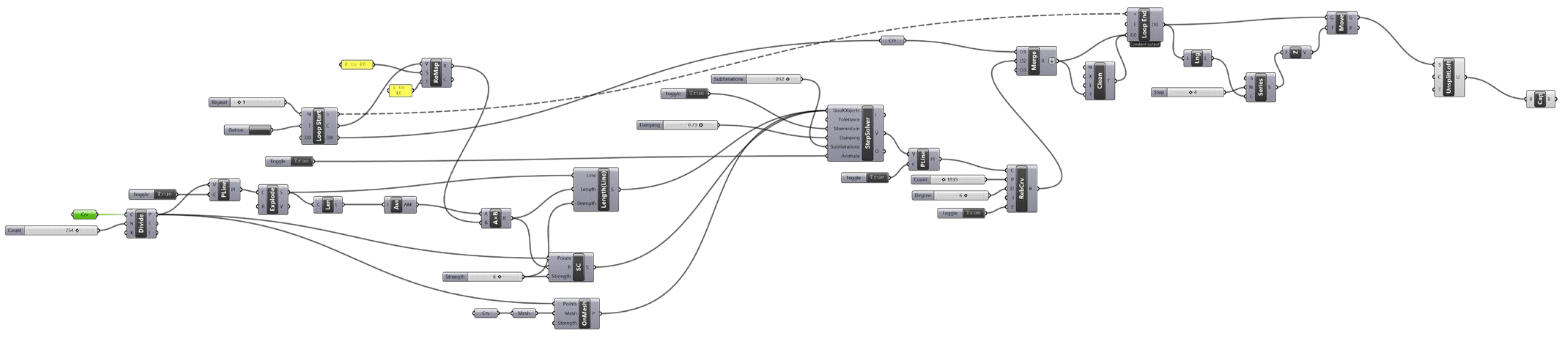 In the subsequent stages of the algorithm, mathematical and logical operations enhance design flexibility and computational control. Arithmetic nodes (e.g., ADDITION, SUBTRACTION, MULTIPLICATION) perform quantitative transformations on the input data, enabling the creation of complex proportional relationships. Logical operations like “GREATER THAN” or “LESS THAN” evaluate conditions and drive conditional behaviors in the design logic. The “GENERIC HASH” node, while not fully specified, appears to function as a customizable component—potentially involved in data indexing or the evaluation of unique states during optimization. Analytical modules such as “AREA” calculate surface metrics, while “MASS ADDITION” may indicate cumulative values for performance tracking. The arrangement of nodes in the right-hand section of
